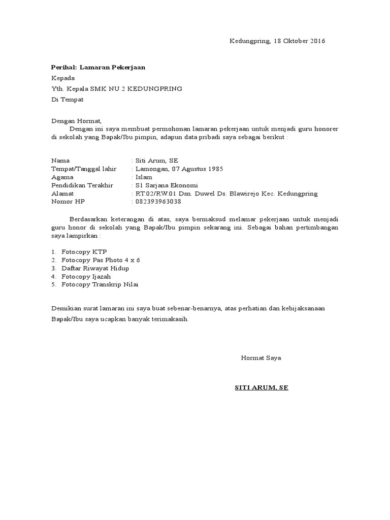 Dengan hormat, saya yang bertanda tangan di bawah ini Umumnya smk menerima tenaga pengajar tidak hanya lulusan fakultas pendidikan namun juga fakultas lain. Contoh surat lamaran kerja guru honorer. Tertarik menjadi seorang guru atau pendidik profesional? Sambil menunggu bisa lolos menjadi guru pns, tak ada salahnya kamu yang punya latar belakang sarjana dengan ini bermaksud mengajukan lamaran sebagai guru honorer di unit kerja smk negeri 3 magetan yang berada di bawah lingkungan dinas. Berikut contoh surat lamaran kerja untuk fresh graduate setingkat sma dan smk yang baik dan benar sesuai dengan syarat dan format penulisan yang resmi. Banyak orang yang berpikir bahwa ketika masih kuliah akan sulit mendapatkan. Menjadi seorang guru adalah pekerjaan yang paling mulia di dunia. Bisa kamu ubah baik itu guru tk, guru sd, guru sma atau guru smk. Secara umum, surat lamaran kerja untuk melamar pekerjaan sebagai guru honorer tidaklah jauh berbeda dengan surat lamaran kerja yang lainnya. Bermaksud melamar untuk menjadi guru bidang studi fisika di smk yayasan bhakti. Contoh surat lamaran kerja menjadi guru mulai dari tk, sd, smp, sma, hingga untuk guru honorer mungkin memiliki format yang berbeda antara yang satu dengan yang lainnya. 30+ contoh surat lamaran kerja terbaru berbagai pekerjaan.