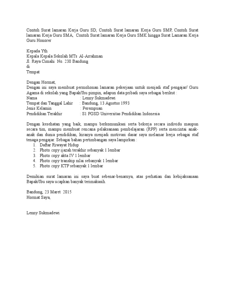 Bersamaan dengan surat lamaran pekerjaan untuk menempati posisi guru honorer di mts negeri parakan, maka saya sangat mengharapkan bisa menjadi bagian keluarga besar mts negeri parakan dalam mencerdaskan putra putri bangsa. Contoh surat lamaran kerja sebagai guru sd, smp, sma, smk. Banyak orang yang berpikir bahwa ketika masih kuliah akan sulit mendapatkan. Bapak/ibu kepala sma negeri 33 jakarta di tempat. Berikut ini beberapa contoh surat lamaran kerja untuk guru yang baik dan benar.